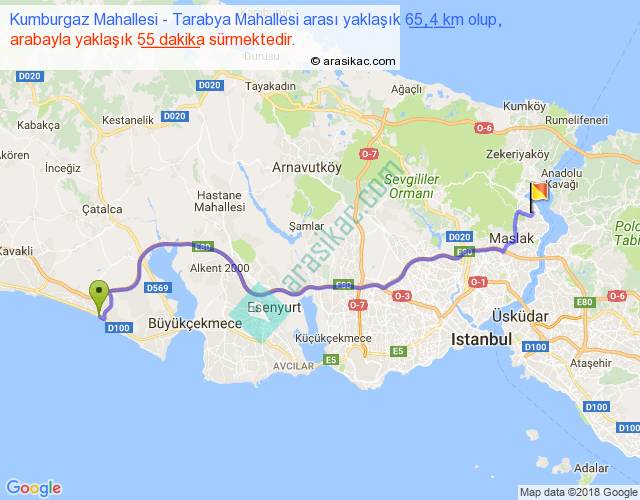 Kumburgaz Mahallesi - Tarabya Mahallesi arası yaklaşık olarak 90 km/h ile yukarıda belirtilen sürede olup, iki yerin kuş uçuşu uzaklığı (mesafesi) 51'dir. Yolculuk otobüsle 1 saat 11 dakika sürmektedir.