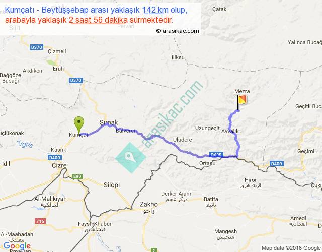 Kumçatı - Beytüşşebap arası yaklaşık olarak 90 km/h ile yukarıda belirtilen sürede olup, iki yerin kuş uçuşu uzaklığı (mesafesi) 77'dir. Yolculuk otobüsle 3 saat 48 dakika sürmektedir.
