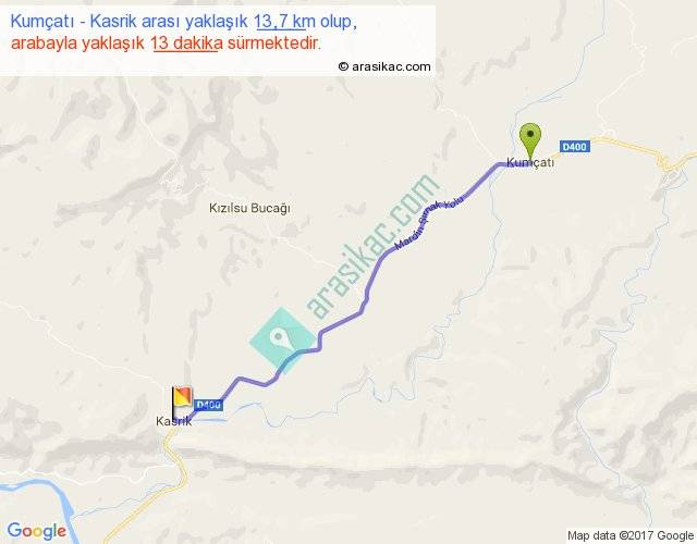 Kumçatı - Kasrik arası yaklaşık olarak 90 km/h ile yukarıda belirtilen sürede olup, iki yerin kuş uçuşu uzaklığı (mesafesi) 12'dir. Yolculuk otobüsle 16 dakika sürmektedir.