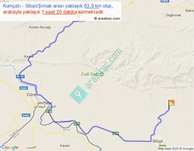 Kumçatı - Silopi Şırnak arası yaklaşık olarak 90 km/h ile yukarıda belirtilen sürede olup, iki yerin kuş uçuşu uzaklığı (mesafesi) 25'dir. Yolculuk otobüsle 1 saat 44 dakika sürmektedir.