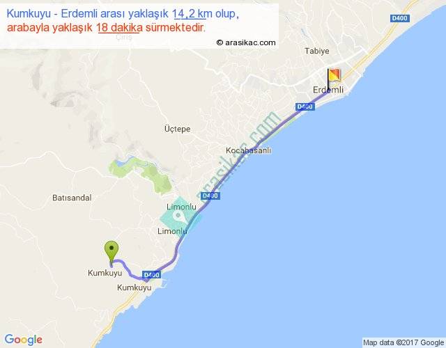 Kumkuyu - Erdemli arası yaklaşık olarak 90 km/h ile yukarıda belirtilen sürede olup, iki yerin kuş uçuşu uzaklığı (mesafesi) 12'dir. Yolculuk otobüsle 23 dakika sürmektedir.