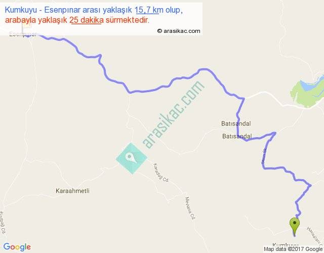 Kumkuyu - Esenpınar arası yaklaşık olarak 90 km/h ile yukarıda belirtilen sürede olup, iki yerin kuş uçuşu uzaklığı (mesafesi) 10'dir. Yolculuk otobüsle 32 dakika sürmektedir.