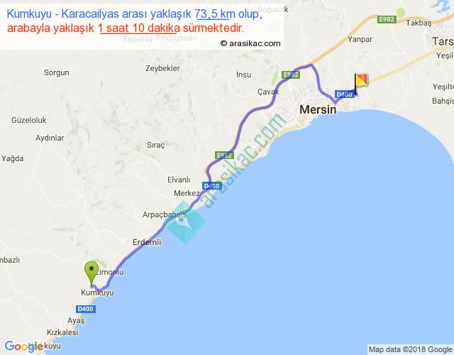 Kumkuyu - Karacailyas arası yaklaşık olarak 90 km/h ile yukarıda belirtilen sürede olup, iki yerin kuş uçuşu uzaklığı (mesafesi) 56'dir. Yolculuk otobüsle 1 saat 31 dakika sürmektedir.