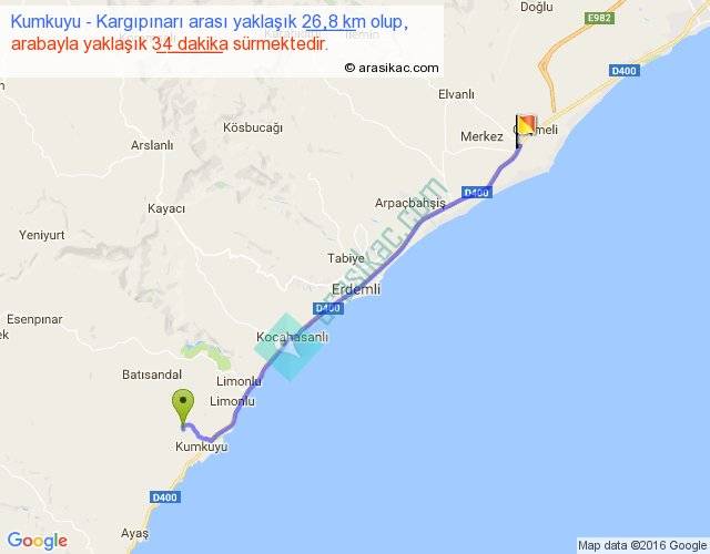 Kumkuyu - Kargıpınarı arası yaklaşık olarak 90 km/h ile yukarıda belirtilen sürede olup, iki yerin kuş uçuşu uzaklığı (mesafesi) 24'dir. Yolculuk otobüsle 44 dakika sürmektedir.