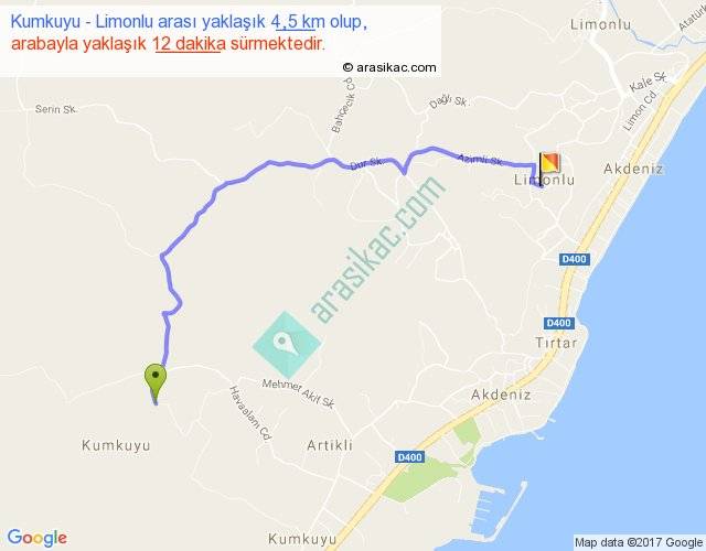 Kumkuyu - Limonlu arası yaklaşık olarak 90 km/h ile yukarıda belirtilen sürede olup, iki yerin kuş uçuşu uzaklığı (mesafesi) 3'dir. Yolculuk otobüsle 15 dakika sürmektedir.
