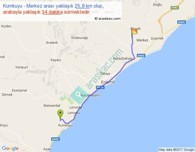 Kumkuyu - Merkez arası yaklaşık olarak 90 km/h ile yukarıda belirtilen sürede olup, iki yerin kuş uçuşu uzaklığı (mesafesi) 22'dir. Yolculuk otobüsle 44 dakika sürmektedir.