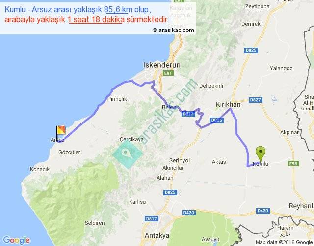 Kumlu - Arsuz arası yaklaşık olarak 90 km/h ile yukarıda belirtilen sürede olup, iki yerin kuş uçuşu uzaklığı (mesafesi) 51'dir. Yolculuk otobüsle 1 saat 41 dakika sürmektedir.