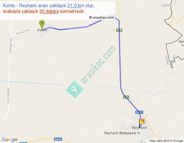 Kumlu - Reyhanlı arası yaklaşık olarak 90 km/h ile yukarıda belirtilen sürede olup, iki yerin kuş uçuşu uzaklığı (mesafesi) 15'dir. Yolculuk otobüsle 26 dakika sürmektedir.