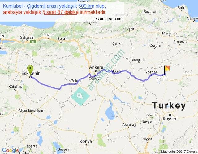 Kumlubel - Çiğdemli arası yaklaşık olarak 90 km/h ile yukarıda belirtilen sürede olup, iki yerin kuş uçuşu uzaklığı (mesafesi) 406'dir. Eğer belirtilen yerler arasında uçak seferi var ise bu süre uçakla 37 dakika'ya kadar düşebilir. Yolculuk otobüsle 7 saat 18 dakika sürmektedir.