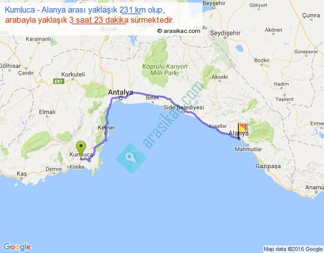 Kumluca - Alanya arası yaklaşık olarak 90 km/h ile yukarıda belirtilen sürede olup, iki yerin kuş uçuşu uzaklığı (mesafesi) 153'dir. Yolculuk otobüsle 4 saat 23 dakika sürmektedir.