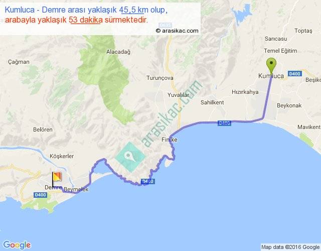 Kumluca - Demre arası yaklaşık olarak 90 km/h ile yukarıda belirtilen sürede olup, iki yerin kuş uçuşu uzaklığı (mesafesi) 30'dir. Yolculuk otobüsle 1 saat 8 dakika sürmektedir.