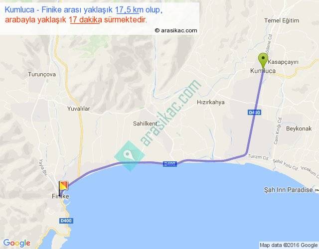 Kumluca - Finike arası yaklaşık olarak 90 km/h ile yukarıda belirtilen sürede olup, iki yerin kuş uçuşu uzaklığı (mesafesi) 15'dir. Yolculuk otobüsle 22 dakika sürmektedir.