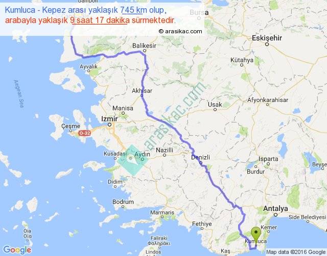 Kumluca - Kepez arası yaklaşık olarak 90 km/h ile yukarıda belirtilen sürede olup, iki yerin kuş uçuşu uzaklığı (mesafesi) 533'dir. Eğer belirtilen yerler arasında uçak seferi var ise bu süre uçakla 49 dakika'ya kadar düşebilir. Yolculuk otobüsle 12 saat 4 dakika sürmektedir.