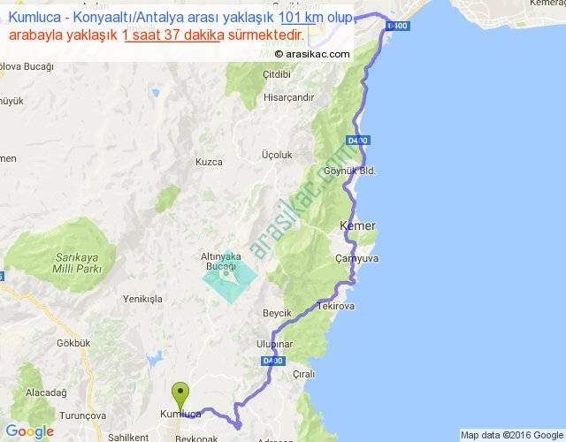 Kumluca - Konyaaltı Antalya arası yaklaşık olarak 90 km/h ile yukarıda belirtilen sürede olup, iki yerin kuş uçuşu uzaklığı (mesafesi) 54'dir. Yolculuk otobüsle 2 saat 6 dakika sürmektedir.