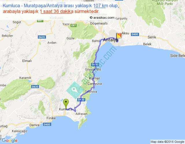 Kumluca - Muratpaşa Antalya arası yaklaşık olarak 90 km/h ile yukarıda belirtilen sürede olup, iki yerin kuş uçuşu uzaklığı (mesafesi) 71'dir. Yolculuk otobüsle 2 saat 4 dakika sürmektedir.