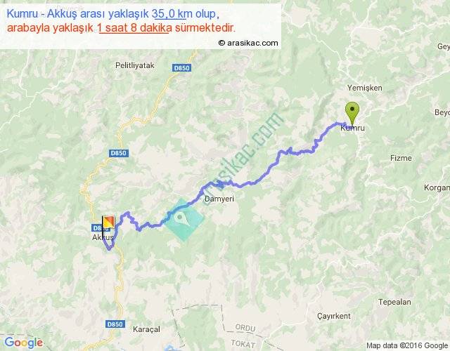 Kumru - Akkuş arası yaklaşık olarak 90 km/h ile yukarıda belirtilen sürede olup, iki yerin kuş uçuşu uzaklığı (mesafesi) 22'dir. Yolculuk otobüsle 1 saat 28 dakika sürmektedir.