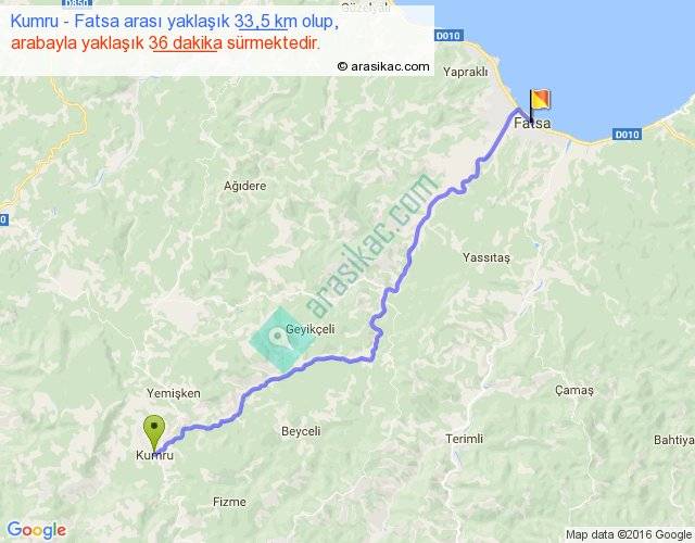 Kumru - Fatsa arası yaklaşık olarak 90 km/h ile yukarıda belirtilen sürede olup, iki yerin kuş uçuşu uzaklığı (mesafesi) 27'dir. Yolculuk otobüsle 46 dakika sürmektedir.