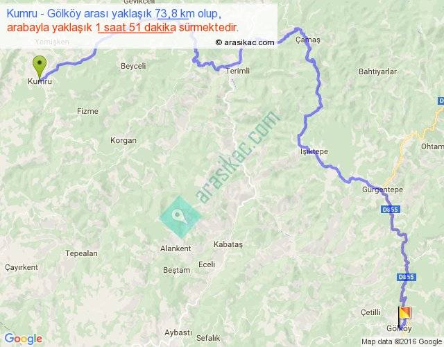 Kumru - Gölköy arası yaklaşık olarak 90 km/h ile yukarıda belirtilen sürede olup, iki yerin kuş uçuşu uzaklığı (mesafesi) 36'dir. Yolculuk otobüsle 2 saat 24 dakika sürmektedir.