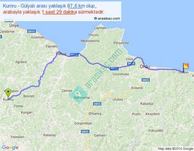 Kumru - Gülyalı arası yaklaşık olarak 90 km/h ile yukarıda belirtilen sürede olup, iki yerin kuş uçuşu uzaklığı (mesafesi) 67'dir. Yolculuk otobüsle 1 saat 55 dakika sürmektedir.