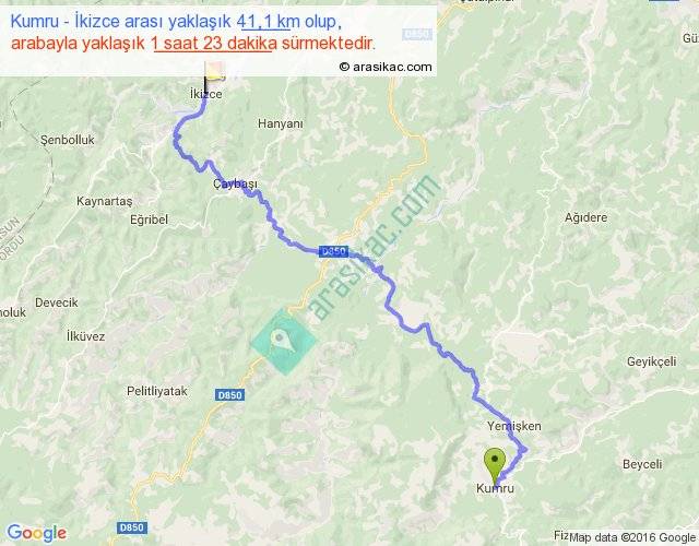 Kumru - İkizce arası yaklaşık olarak 90 km/h ile yukarıda belirtilen sürede olup, iki yerin kuş uçuşu uzaklığı (mesafesi) 26'dir. Yolculuk otobüsle 1 saat 47 dakika sürmektedir.