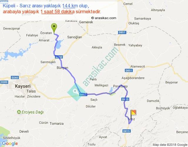 Küpeli - Sarız arası yaklaşık olarak 90 km/h ile yukarıda belirtilen sürede olup, iki yerin kuş uçuşu uzaklığı (mesafesi) 93'dir. Yolculuk otobüsle 2 saat 33 dakika sürmektedir.