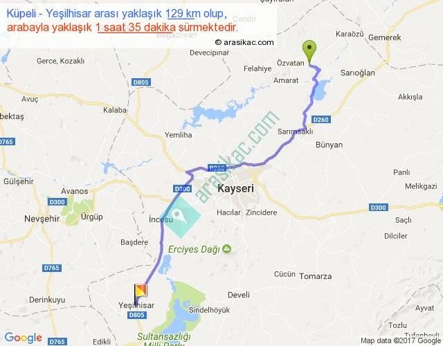 Küpeli - Yeşilhisar arası yaklaşık olarak 90 km/h ile yukarıda belirtilen sürede olup, iki yerin kuş uçuşu uzaklığı (mesafesi) 101'dir. Yolculuk otobüsle 2 saat 3 dakika sürmektedir.