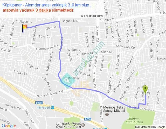 Küplüpınar - Alemdar arası yaklaşık olarak 90 km/h ile yukarıda belirtilen sürede olup, iki yerin kuş uçuşu uzaklığı (mesafesi) 2'dir. Yolculuk otobüsle 11 dakika sürmektedir.