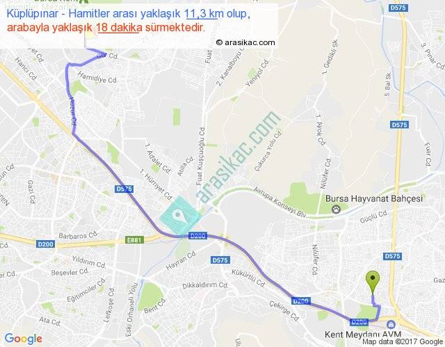 Küplüpınar - Hamitler arası yaklaşık olarak 90 km/h ile yukarıda belirtilen sürede olup, iki yerin kuş uçuşu uzaklığı (mesafesi) 8'dir. Yolculuk otobüsle 23 dakika sürmektedir.