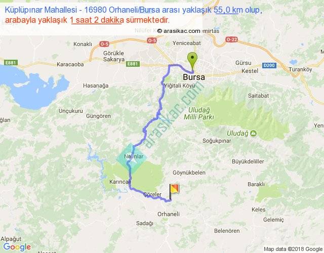 Küplüpınar Mahallesi - 16980 Orhaneli Bursa arası yaklaşık olarak 90 km/h ile yukarıda belirtilen sürede olup, iki yerin kuş uçuşu uzaklığı (mesafesi) 30'dir. Yolculuk otobüsle 1 saat 20 dakika sürmektedir.
