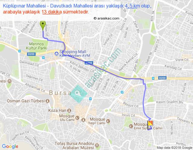 Küplüpınar Mahallesi - Davutkadı Mahallesi arası yaklaşık olarak 90 km/h ile yukarıda belirtilen sürede olup, iki yerin kuş uçuşu uzaklığı (mesafesi) 3'dir. Yolculuk otobüsle 16 dakika sürmektedir.
