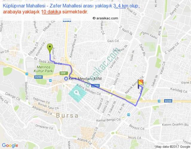 Küplüpınar Mahallesi - Zafer Mahallesi arası yaklaşık olarak 90 km/h ile yukarıda belirtilen sürede olup, iki yerin kuş uçuşu uzaklığı (mesafesi) 2'dir. Yolculuk otobüsle 13 dakika sürmektedir.