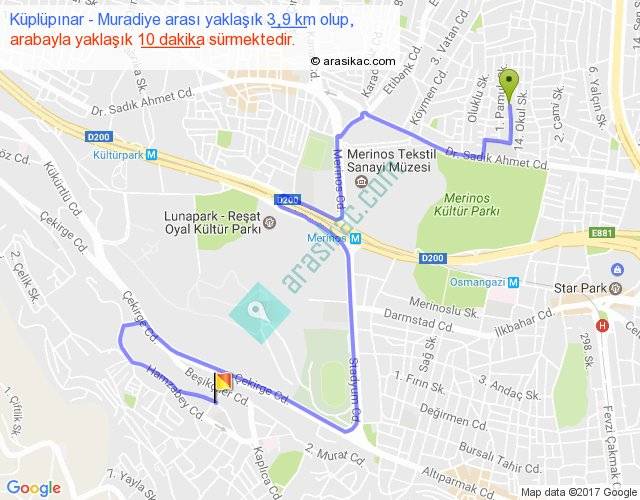 Küplüpınar - Muradiye arası yaklaşık olarak 90 km/h ile yukarıda belirtilen sürede olup, iki yerin kuş uçuşu uzaklığı (mesafesi) 2'dir. Yolculuk otobüsle 13 dakika sürmektedir.