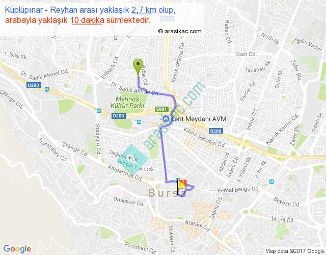 Küplüpınar - Reyhan arası yaklaşık olarak 90 km/h ile yukarıda belirtilen sürede olup, iki yerin kuş uçuşu uzaklığı (mesafesi) 2'dir. Yolculuk otobüsle 13 dakika sürmektedir.