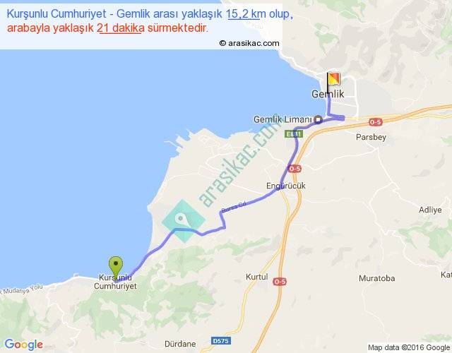 Kurşunlu Cumhuriyet - Gemlik arası yaklaşık olarak 90 km/h ile yukarıda belirtilen sürede olup, iki yerin kuş uçuşu uzaklığı (mesafesi) 12'dir. Yolculuk otobüsle 27 dakika sürmektedir.