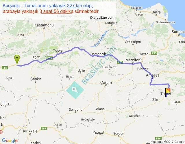 Kurşunlu - Turhal arası yaklaşık olarak 90 km/h ile yukarıda belirtilen sürede olup, iki yerin kuş uçuşu uzaklığı (mesafesi) 243'dir. Yolculuk otobüsle 5 saat 6 dakika sürmektedir.
