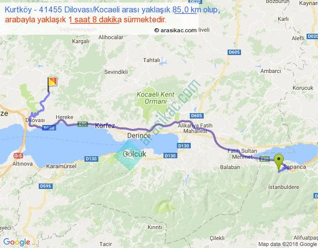 Kurtköy - 41455 Dilovası Kocaeli arası yaklaşık olarak 90 km/h ile yukarıda belirtilen sürede olup, iki yerin kuş uçuşu uzaklığı (mesafesi) 56'dir. Yolculuk otobüsle 1 saat 28 dakika sürmektedir.