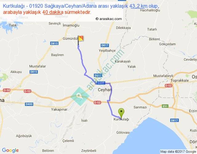 Kurtkulağı - 01920 Sağkaya Ceyhan Adana arası yaklaşık olarak 90 km/h ile yukarıda belirtilen sürede olup, iki yerin kuş uçuşu uzaklığı (mesafesi) 34'dir. Yolculuk otobüsle 52 dakika sürmektedir.