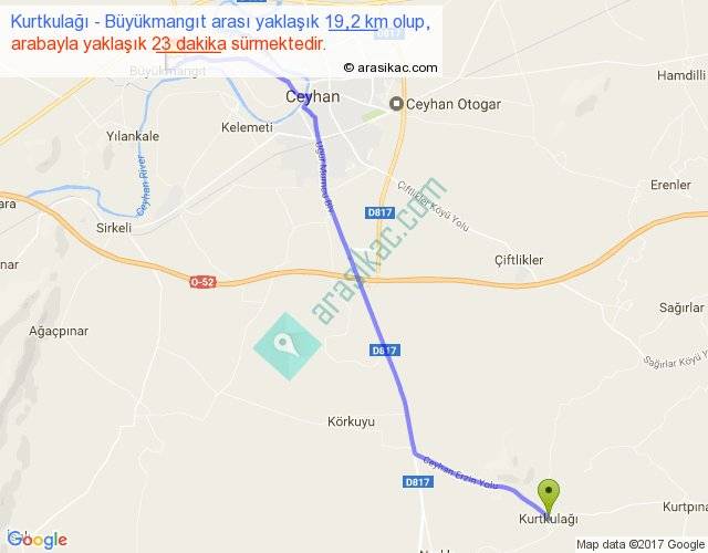 Kurtkulağı - Büyükmangıt arası yaklaşık olarak 90 km/h ile yukarıda belirtilen sürede olup, iki yerin kuş uçuşu uzaklığı (mesafesi) 16'dir. Yolculuk otobüsle 29 dakika sürmektedir.