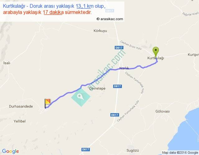 Kurtkulağı - Doruk arası yaklaşık olarak 90 km/h ile yukarıda belirtilen sürede olup, iki yerin kuş uçuşu uzaklığı (mesafesi) 12'dir. Yolculuk otobüsle 22 dakika sürmektedir.