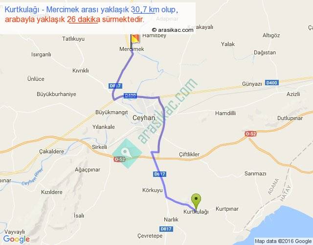 Kurtkulağı - Mercimek arası yaklaşık olarak 90 km/h ile yukarıda belirtilen sürede olup, iki yerin kuş uçuşu uzaklığı (mesafesi) 22'dir. Yolculuk otobüsle 33 dakika sürmektedir.