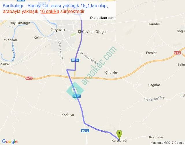 Kurtkulağı - Sanayi Cd. arası yaklaşık olarak 90 km/h ile yukarıda belirtilen sürede olup, iki yerin kuş uçuşu uzaklığı (mesafesi) 14'dir. Yolculuk otobüsle 20 dakika sürmektedir.