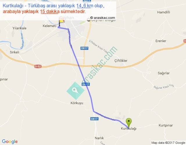 Kurtkulağı - Türlübaş arası yaklaşık olarak 90 km/h ile yukarıda belirtilen sürede olup, iki yerin kuş uçuşu uzaklığı (mesafesi) 13'dir. Yolculuk otobüsle 19 dakika sürmektedir.