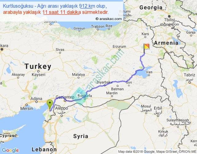 Kurtlusoğuksu - Ağrı arası yaklaşık olarak 90 km/h ile yukarıda belirtilen sürede olup, iki yerin kuş uçuşu uzaklığı (mesafesi) 687'dir. Eğer belirtilen yerler arasında uçak seferi var ise bu süre uçakla 1 saat 03 dakika'ya kadar düşebilir. Yolculuk otobüsle 14 saat 32 dakika sürmektedir.