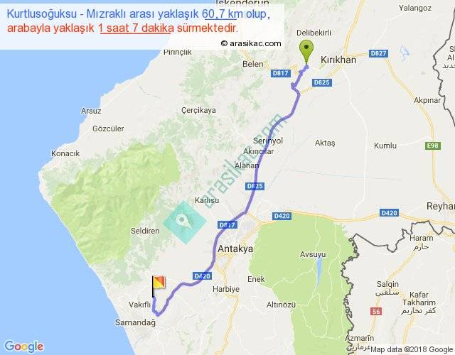 Kurtlusoğuksu - Mızraklı arası yaklaşık olarak 90 km/h ile yukarıda belirtilen sürede olup, iki yerin kuş uçuşu uzaklığı (mesafesi) 48'dir. Yolculuk otobüsle 1 saat 27 dakika sürmektedir.