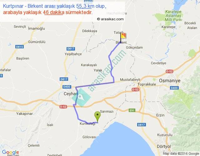Kurtpınar - Birkent arası yaklaşık olarak 90 km/h ile yukarıda belirtilen sürede olup, iki yerin kuş uçuşu uzaklığı (mesafesi) 32'dir. Yolculuk otobüsle 59 dakika sürmektedir.