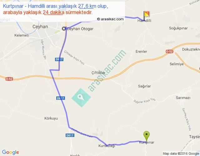 Kurtpınar - Hamdilli arası yaklaşık olarak 90 km/h ile yukarıda belirtilen sürede olup, iki yerin kuş uçuşu uzaklığı (mesafesi) 12'dir. Yolculuk otobüsle 31 dakika sürmektedir.