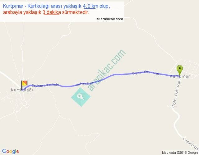 Kurtpınar - Kurtkulağı arası yaklaşık olarak 90 km/h ile yukarıda belirtilen sürede olup, iki yerin kuş uçuşu uzaklığı (mesafesi) 4'dir. Yolculuk otobüsle 3 dakika sürmektedir.