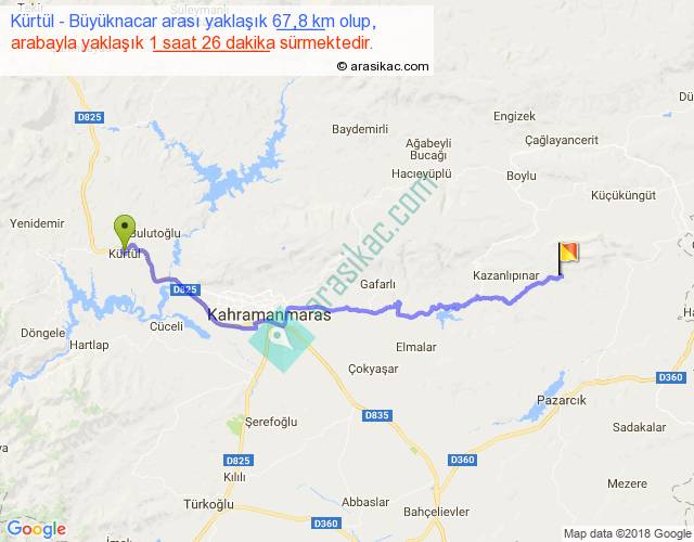 Kürtül - Büyüknacar arası yaklaşık olarak 90 km/h ile yukarıda belirtilen sürede olup, iki yerin kuş uçuşu uzaklığı (mesafesi) 48'dir. Yolculuk otobüsle 1 saat 51 dakika sürmektedir.