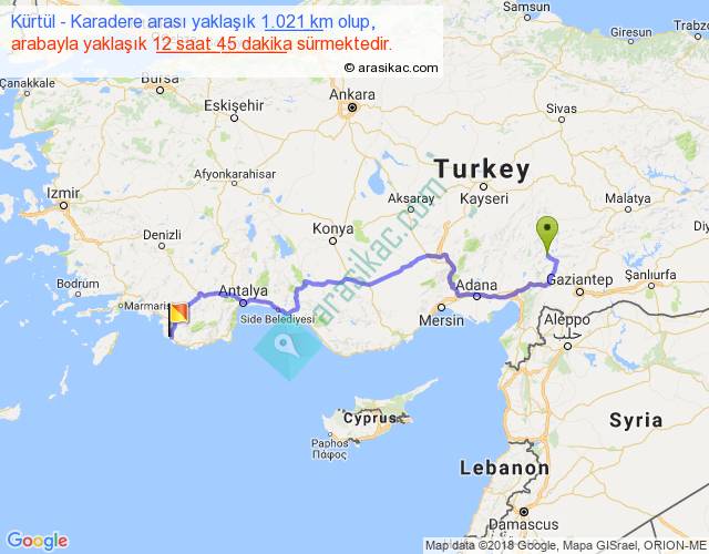 Kürtül - Karadere arası yaklaşık olarak 90 km/h ile yukarıda belirtilen sürede olup, iki yerin kuş uçuşu uzaklığı (mesafesi) 674'dir. Eğer belirtilen yerler arasında uçak seferi var ise bu süre uçakla 1 saat 02 dakika'ya kadar düşebilir. Yolculuk otobüsle 16 saat 34 dakika sürmektedir.