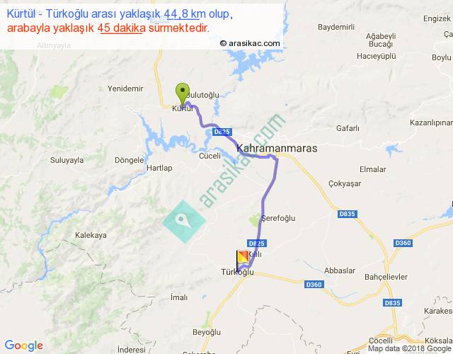 Kürtül - Türkoğlu arası yaklaşık olarak 90 km/h ile yukarıda belirtilen sürede olup, iki yerin kuş uçuşu uzaklığı (mesafesi) 29'dir. Yolculuk otobüsle 58 dakika sürmektedir.